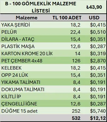 100 Adet gömlek için;