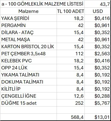 100 Adet gömlek için,